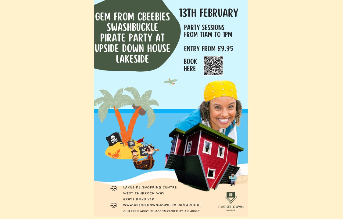 We are delighted to announce that BAFTA-winning CBEEBIES star Gemma Hunt will be hosting a number of short pirate themed parties for small groups of children for one day only at Upside Down House Lakeside, Essex on Monday 13th February.